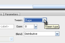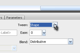Kliknite na frame 1 in spodaj v polju properties določite Tween na Shape.