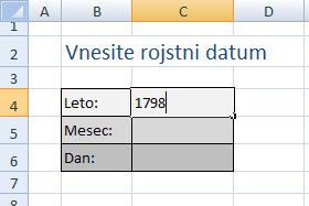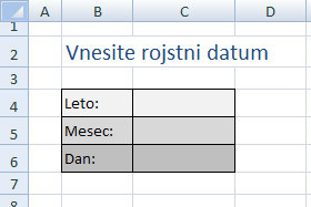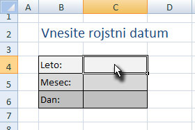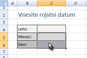 ![]() Sedaj pa z miško označite celici, ki predstavljate polja za vnos meseca in dneva (glej sliko). |