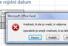 ![]() Excel vas bo opozoril, da vnešena vrednost ni veljavna. |