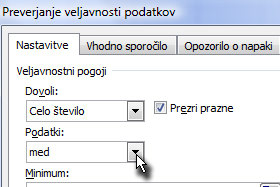 ![]() V novem okno dololčite polju Dovoli preko izbirnika na Celo število in Podatki na med. |