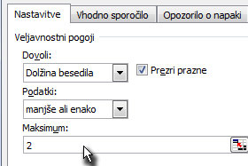![]() V novem oknu določite polju Dovoli preko izbrinika na Dolžina besedila, Podatki na manjše ali enako in Maksimum na 2. |