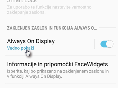 ![]() Možnost Always On Display naj bo vklopljena. Potem pa tapnite na Always On Display beedilo, da prikažete več možnosti. |