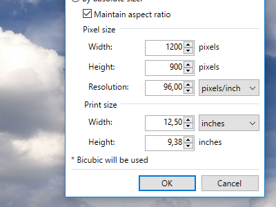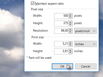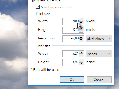 ![]() Spremenite sedaj vrednost Width na manjšo in opazili boste, da se je Height vrednost proporcionalno prav tako spremenila. Ker je Maintain aspect ratio, se dimenzije spreminjajo proporcionalno. |