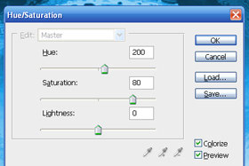 Potem pa označite Colorize, Hue nastavite 200, Saturation 80 in Lightness 0. Potrdite na gumb OK. |