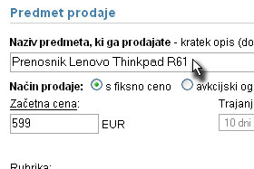 V naziv predmeta, ki ga prodajate vpišite ime artikla. Jaz sem vpisal ime in tip računalnka. V polje Začetna cena vpišite znesek za artikel. in določite ali je način prodaje s fiksno ceno ali avkcijski oglas. |