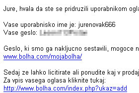 Odprite vaš e-poštni predal (gmail, email.si, hotmail...) in v njem boste našli sporočilo od Bolhe, kjer se nahaja vaše uporabniško ime in geslo.