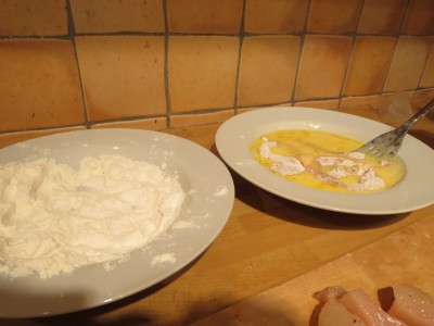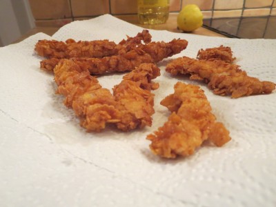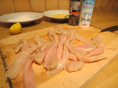 Pripravite piščančje prsi in jih naresite na male podolgovate trakove (glej sliko). Potem jih tudi posolite in popoprajte. |