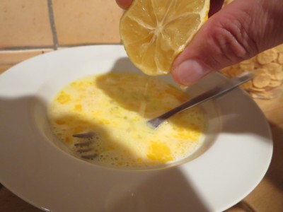 Pripravite krožnik, v katerega razbijte dve jajci in potem vanj iztisnite pol limone. |