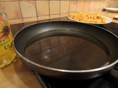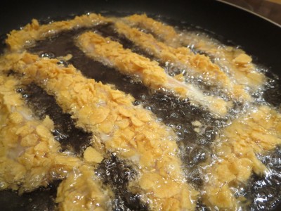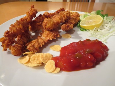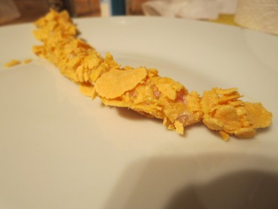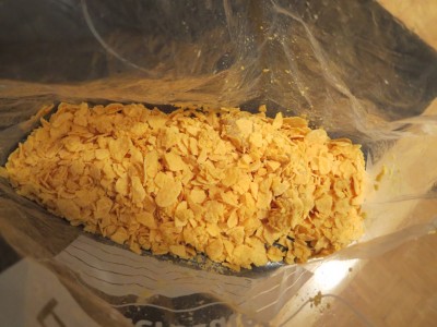 Potem pa pripravite neko vrečko in vanj stresite koruzne kosmiče (kornfleks). Koruzne kosmiče delno zdrobite, vendar ne preveč. Namesto vrečke lahko uporabite tudi tretji krožnik. |