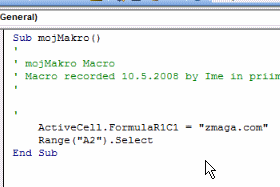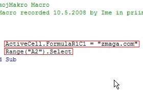 ActiveCell.FormulaR1C1 = "zmaga.com" Range("A2").Select Razlaga. ActiveCell pomeni aktivna celica to je bilo v tistem trenutku A1. FormulaR1C1 predstavlja vsebino te celice in za enačajem se glasi besedilo v dvojnih narekovajih. Range pomeni območje v oklepajih je zapisano ime celice ter Select pomeni izberi/aktiviraj to celico. |
