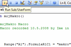 V oknu je sedaj izpisan vaš makro. Če pogledate se besedilo začne z Sub mojMakro () - to predstavlja začetek makra. Nato so izpisani komentarji makra (vse za ' je komentar), nato je izpisana vsebina makra in na koncu je zapisano End Sub - konec makra.
