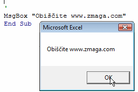 Povem vam še en ukaz : MsgBox "Obiščite www.zmaga.com" Ta vam odpre sporočilo kjer se izpiše besedilo med dvojnima narekovajema. Makri delujejo v vseh Office programih. Preizkusite. Raziskujte. |