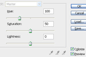 Potem pa se poigrajte z drsniki in potrdite na gumb OK. Jaz sem nastavil Hue 100, Saturation 50 in Lightness 0. |