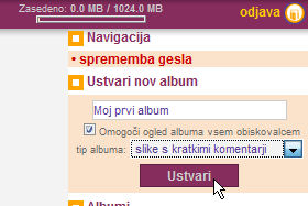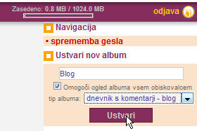 Sedaj moramo ustvariti album. Izberemo mu ime in ga vpišemo v vnosno polje skrajno desno. Če želite, da album vidijo vsi obiskovalci, pustite polje obkljukano, sicer odkljukajte. Tip albuma izberite 'slike s kratkimi komentarji'.