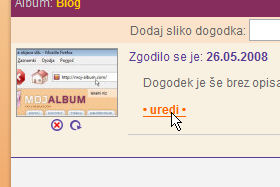Komentar je sedaj prikazan pod sliko. Dodajate pa lahko tudi albume, v katerih pišete dnevnike - BLOG. Pritisnemo 'Domov' in ponovno izpolnimo obrazec za nov album vendar sedaj kot tip albuma izberete 'dnevnik s komentarji - blog'. Pritisnemo 'Ustvari'.