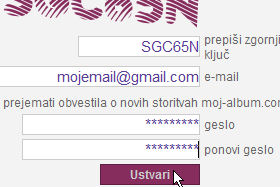 Sedaj moramo vpisati svoje podatke. Najprej prepišemo varnostno kodo iz slike, vpišemo e-mail ter željeno geslo. Pritisnemo 'Ustvari'.