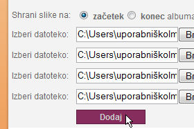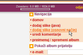 Ko smo ustvarili album moramo vanj vnesti slike. To lahko storimo preko dveh načinov: z java programčkom ali pa navadno preko strani. Meni je navadno dodajanje slik boljše, lahko pa izberete tudi java možnost.