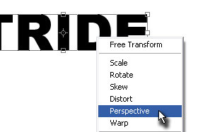 Potem pa pritisnite tipki CTRL + T, da označite tekstovni layer. Kliknite na označeno z desnim miškinim gumbom in izberite Perspective. |