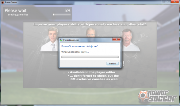 danes sem začel igrati igro Power Soccer. OK, namestim Plugin in igranje se začne. Vendar, ko hočem tekmo odigrati, se mi vedno pri 5 % ustavi in Windows 7 mi sporoča napako.