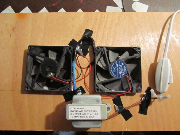 Ventilatorje sem zvezal na pretvornik napetosti in na 230. Pretvornik sem našel nekje doma in ne vem točno od česa je ampak ustreza ker pretvori iz 230 na 11V.