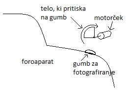 Na hitro ideja mehanizma... manjši motorček npr. iz kakega starega kasetofona, na baterije, ga upočasniš z uporom, da naredi 2 obrata v minuti. Na os motorčka namestiš četrt kroga, iz plastike recimo in motorček nekako namestiš, da se polkrog vrti čez gumb za fotografiranje... vsaj jaz bi se tega amatersko tako lotil z doma narejenimi rečmi