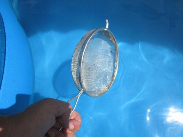 Ali ima kdo idejo, kako bi bazen lahko očistil (prilagam tudi fotografije)? Razmišljal sem o cedilu, vendar dvomim, da bo to kaj pomagalo? Ne bi pa rad menjal vode vsak dan, saj mi jo je škoda!