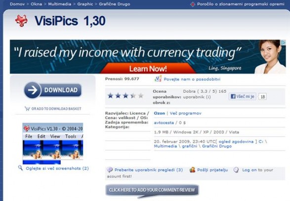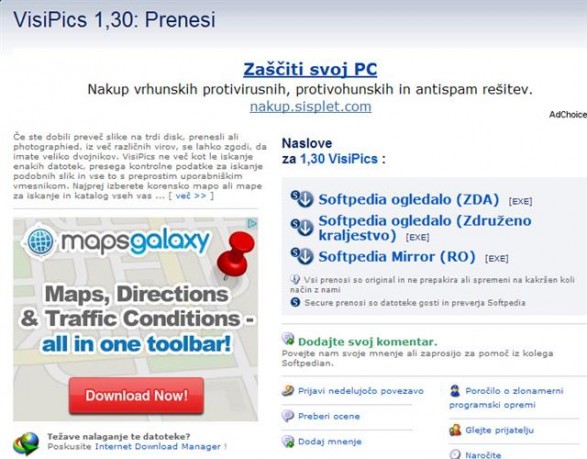 Delam lepo po lekciji "Iskanje podvojenih fotografij", pa mi na spletni strani nikakor ne uspe prenesti programa VisiPics. Prilagam dva posnetka ekrana...Kam naj kliknem? Ko kliknem po navodilih v lekciji na "spletno stran" se odpre prva slika. Nato kliknem na Download - se odpre okno kot kaže druga slika. Potem pa sem poizkusila na vse možne klike, pa nikjer ne da možnosti za prenos programa, ki ga želim imeti, da počistim med množico podvojenih fotografij. Že vnaprej hvala za pomoč!