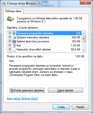 Program bo nekaj časa izračunaval, koliko prostora bo mogoče sprostiti na pogonu in ti prikazal nato spodnjo sliko. Označi vse možnosti in klikni na V redu.