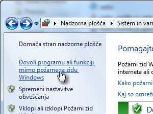 Preveri ali server gre mimo požarnega zidu Windows. To storiš tako, da greš na nadzorno ploščo, klikneš Sistem in varnost, nato pa Požarni zid Windows. V levem stolpcu klikni na besedilo, ki je prikazano spodaj na sliki:
