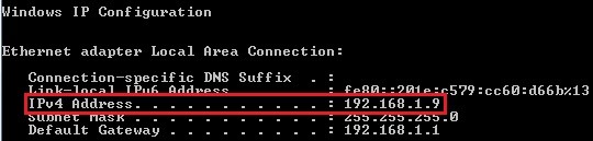 IP računalnika lahko preveriš tako, da zaženeš CMD (Command Prompt) in vpišeš ipconfig. Pravi naslov je naslov, ki je označen spodaj: