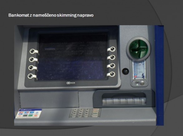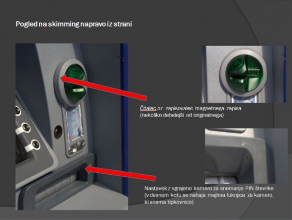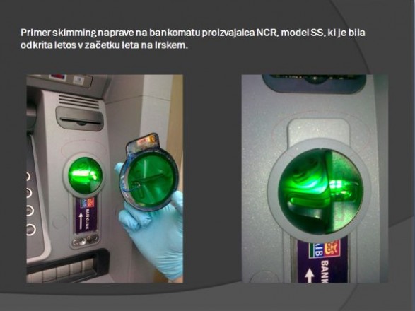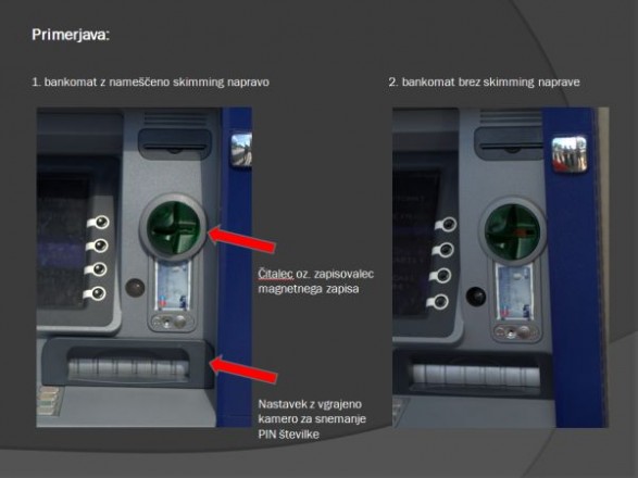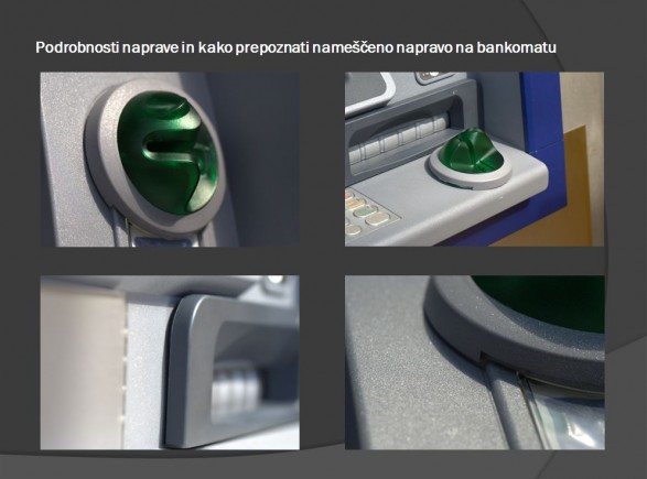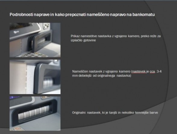 Spodaj je nekaj slik, kako lahko prepoznati bankomat z nameščeno "skimming" napravo, ki prebere magnetni zapis vaše bančne kartice ter posname vašo PIN številko.