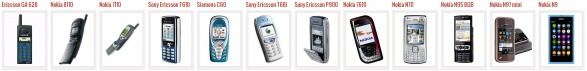 Nokia 3310 Nokia 3410 Sony Ericsson T300 Motorola C261 Sony Ericsson k610i Nokia 6101 Nokia 6630 Sony Ericsson W995 Samsung Galaxy S III
