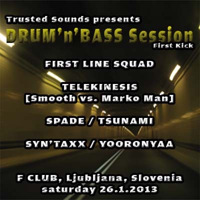 Zatorej, rezervirajte si januar za DRUM’n'BASS zasedanje z najboljšo glasbo, kjer si boste s plesom do jutra razmigali vse mišice. Trusted Sounds in F Klub vabita, da se jim 26.1.2013 pridružite na glasbenem rajanju, ki ga še dolgo ne boste pozabili.