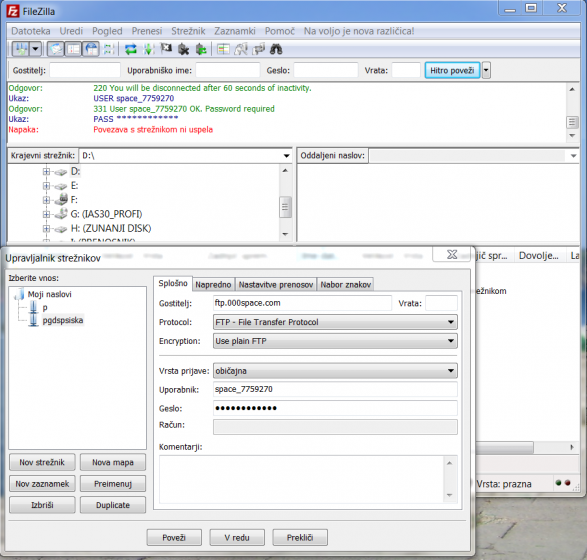 Zakj se ne morem povezati s strežnikomftp.000space.com spletna stran mi deluje normalno.