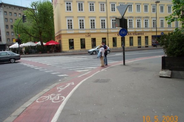 Zakon, da mora kolesar prečkati cesto peš, kjer ni prehoda za kolesarje in je recimo samo za peščce, seveda obstaja. Na sliki je za kolesarje vse OK in imajo prednost pred avtomobili.