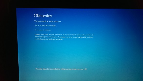 vse sem probal ampak ko prižgem računalnik mi pokaže to sliko ko stisnem esc pa gre v bios kluč na katerem je windows sploh ne zalaufa kaj še lahko naredim ko prižgem se pojavi slika obnovitev pol pa v bios in tema ali lahko kako drugače ali iz biosa pridem v command prompt če bi kdor kaj vedel naj mi javi že v naprej se zahvaljujem