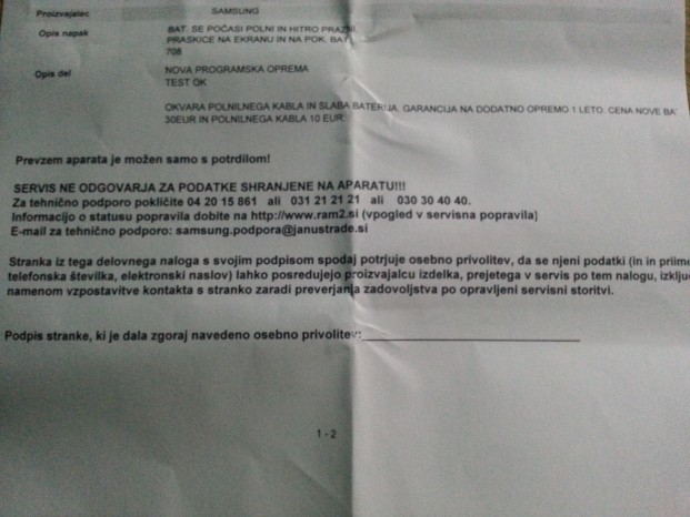 Malo sem še brskal po dokumentih, ki sem jih dobil pri prevzemu telefona. Izgleda, da mi garancije niso upoštevali, ker mislijo, da je napaka z baterijo ali s polnilcem (ni napaka v bateriji, sem poskusil z drugo baterijo je isto in tudi v polnilcu ne more biti napaka, saj se mi baterija tudi hitro prazni, ne le polni), ki imata garancije samo eno leto.