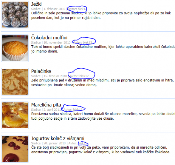 http://www.zmaga.com/content.php?id=3914 gledal sem ta recept potem sem pogledal še kakšni recepti so spodaj pokaže mi da je na vseh receptih avtor blek12 ko pa kliknem na recept se pa prikaže ime pravega avtorja