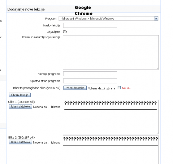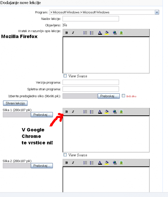 Pod Sodeluj in Dodajanje nove lekcije v Google Chrome nekaj manjka. Manjka vrstica za urejanje besedila: