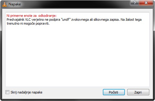 Predvajalnik VLC verjetno ne podpira "undf" zvokovnega ali sli