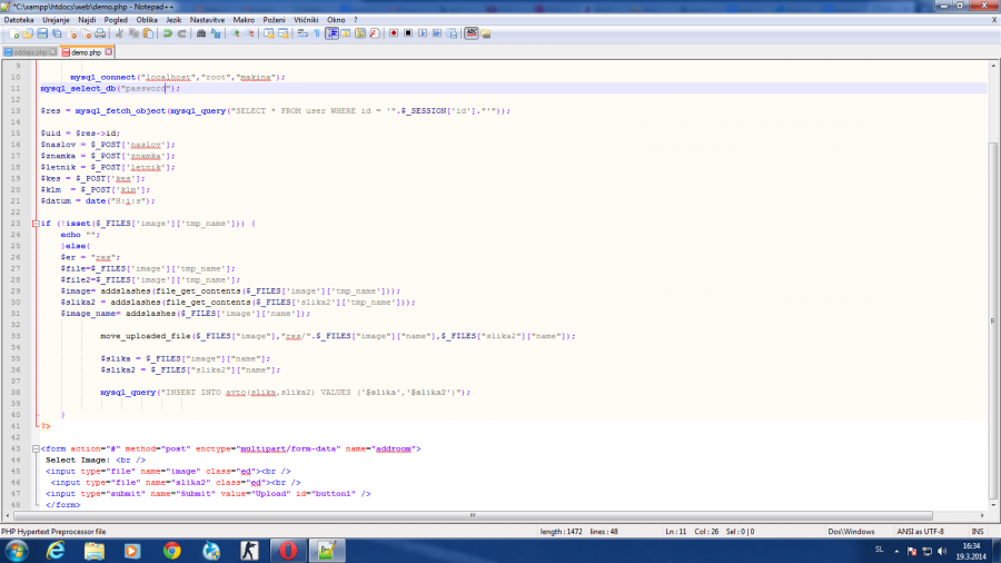 To je koda ima pa problem rad bi več slik pravil na en id 5,6 slik če,gdo pozna kodo ima tudi problem pri shranjevanju slik v mapo mi ne shrani v bazo pa pove da,sem dodal 2 sliki hotel sem kodo postavit ampak ne gre koda da bi laho vidli od blizu ne vem zaka noče