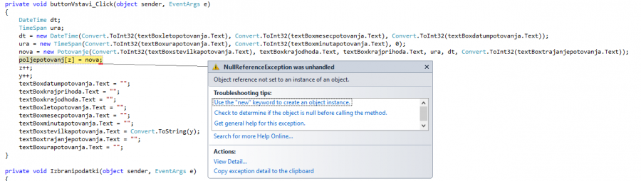 delam program v C# in ko hočem podatke z gumbom Vstavi prenesti v dataGridView, mi javi napako NullReferenceException was unhandled.