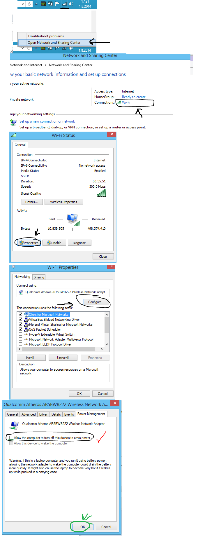 sedaj imam nov prenosnik z windowsi 8 in kadar je povezava prekinjena se naredi rumen kazalček na ikonci.