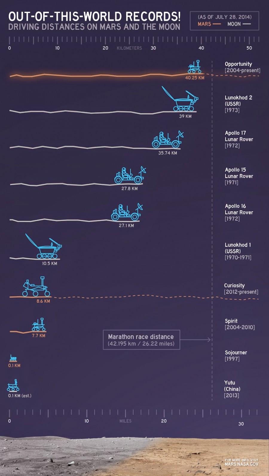 Spodnji grad nam ilustrira primerjavo med prevoženimi razdaljami različnih vozil na Marsu in Luni. Opportunity je še vedno zmagovalec. Graf velja od leta 2014 naprej.