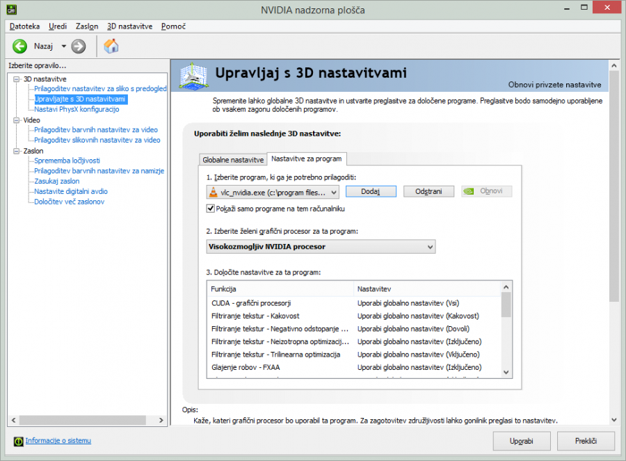 3. V Nvidia nastavitvah sem potem nastavil, da VLC uporablja grafično kartico in ne integrirano