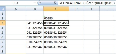 Zdravo, zanima me katero funkcijo bi uporabil za izpis telefonskih številk v stolpcu C3 do C8. Namesto številke 041 123456 bi moral dobiti številko 00386 41 123456, torej dodati 00386 in odvzeti eno 0.