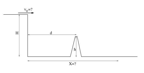 Otrok se spusti s smučmi preko H = 1,6 m visoke skakalnice z vodoravno odskočno mizo. Kolikšno naj-manjšo hitrost mora otrok na skakalnici doseči v vodo-ravni smeri, da bo še priletel preko h = 0,75 m visoke ovire, ki je od skakalnice oddaljena d = 1,25 m? Kako daleč od skakalnice in s kolikšno hitrostjo bo otrok do-skočil na ravno podlago?