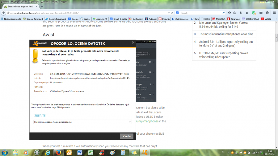 Pojavlja se mi okno z opozorilom