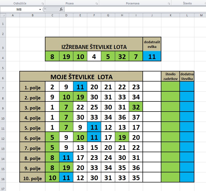 Potrebuje formulo za tole tabelo za pregled LOTO listka oblikovanje celic po barvi ob zadetku mi je uspelo narediti, formulo da mi prešteje število zadetkov,za vsako polje posebaj + dodatno številko pa ne gre.