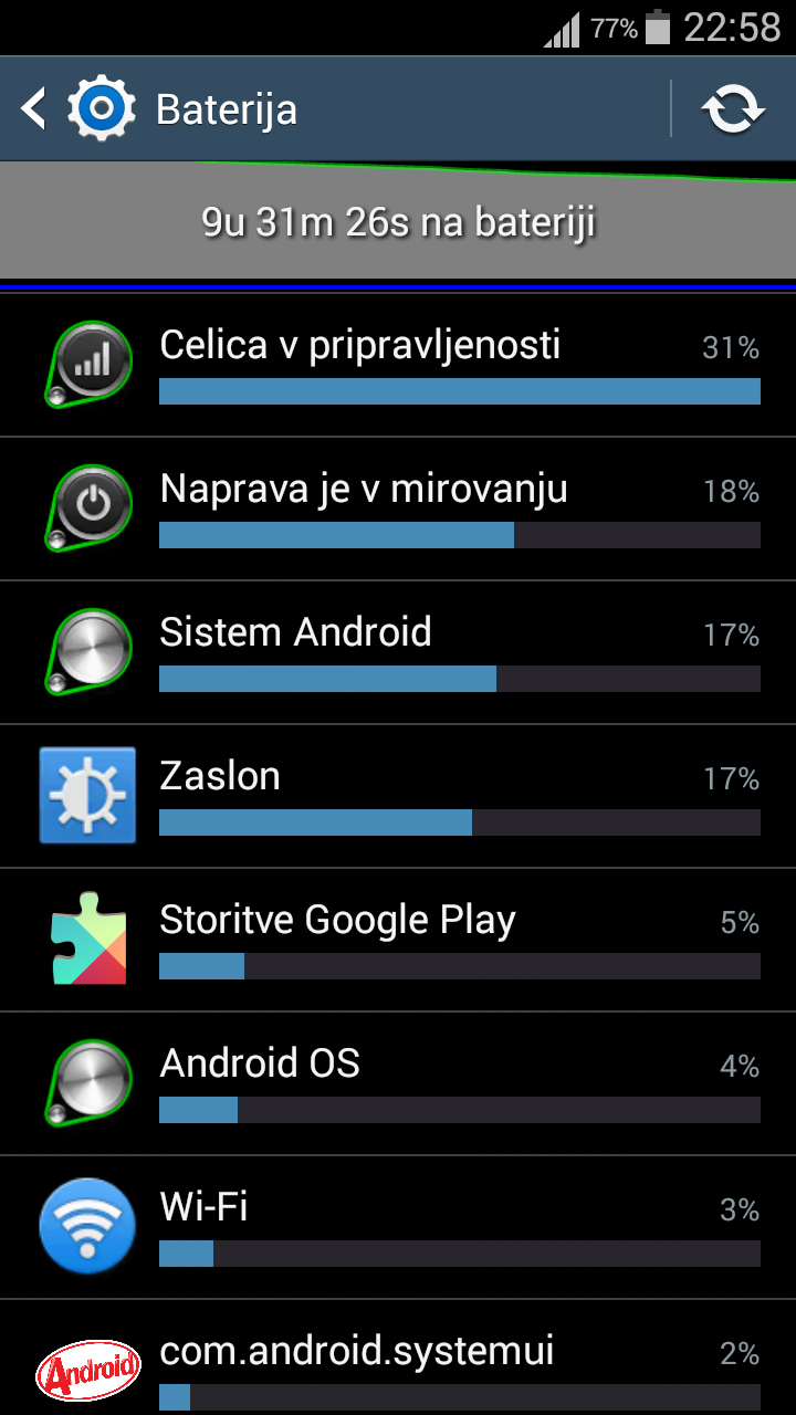Zanimivo to sem sam probal par dni nazaj in ni nič pomagalo.. Mam S3 LTE verzijo in Android 4.4.4.. Do par dni nazaj je baterija fajn zdržala v mirovanju mi je v 2 urah in 30 minut porabil 1% sedaj od enkrat v 45 minutah 1% itn.. Telefon sem ponastavil na tovarniške nastavitve imel 24ur na testu brez dodatnih aplikaciji in je bilo isto. čez noč pobere prej 3% sedaj pa od 8 do 15% kar se mi zdi nenormalno v mirovanju..